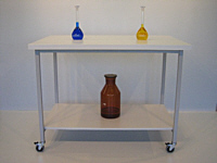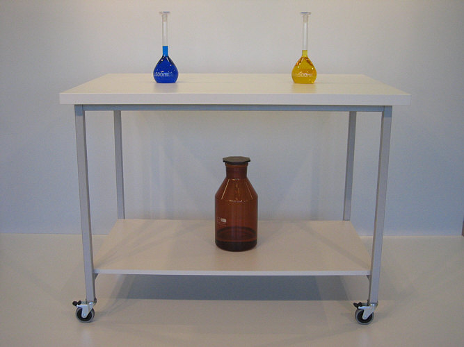 verschiedene Arbeitsflächenversionen. Zwischenboden mit Melaminharzbeschichtung, 4 Lenkrollen, 2 davon feststellbar. Stahlrohrkonstruktion in weiß - Aluminium. Tragkraft bis 200kg/m2